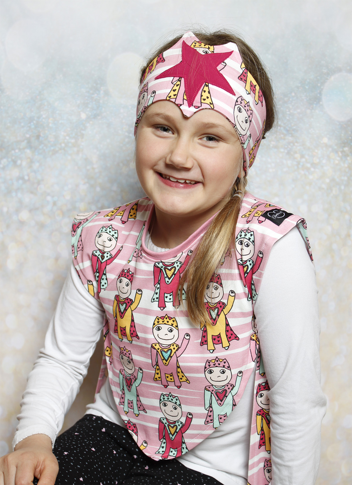 Prinsessa, mikäs sen kivempaa kuin leikkiä prinsessaa. Lapsi itse on kankaassa oleva prinsesssa. Hänellä on yllään viitta ja panta päässä, ihan kuten kankaassakin. Viitan prinsessan voi nimetä vaikka lapsen oman nimen mukaan. Sukkahousut ja paidan jos etsii kankaan Prinsessan väreihin sopivaksi, niin täydellistä!