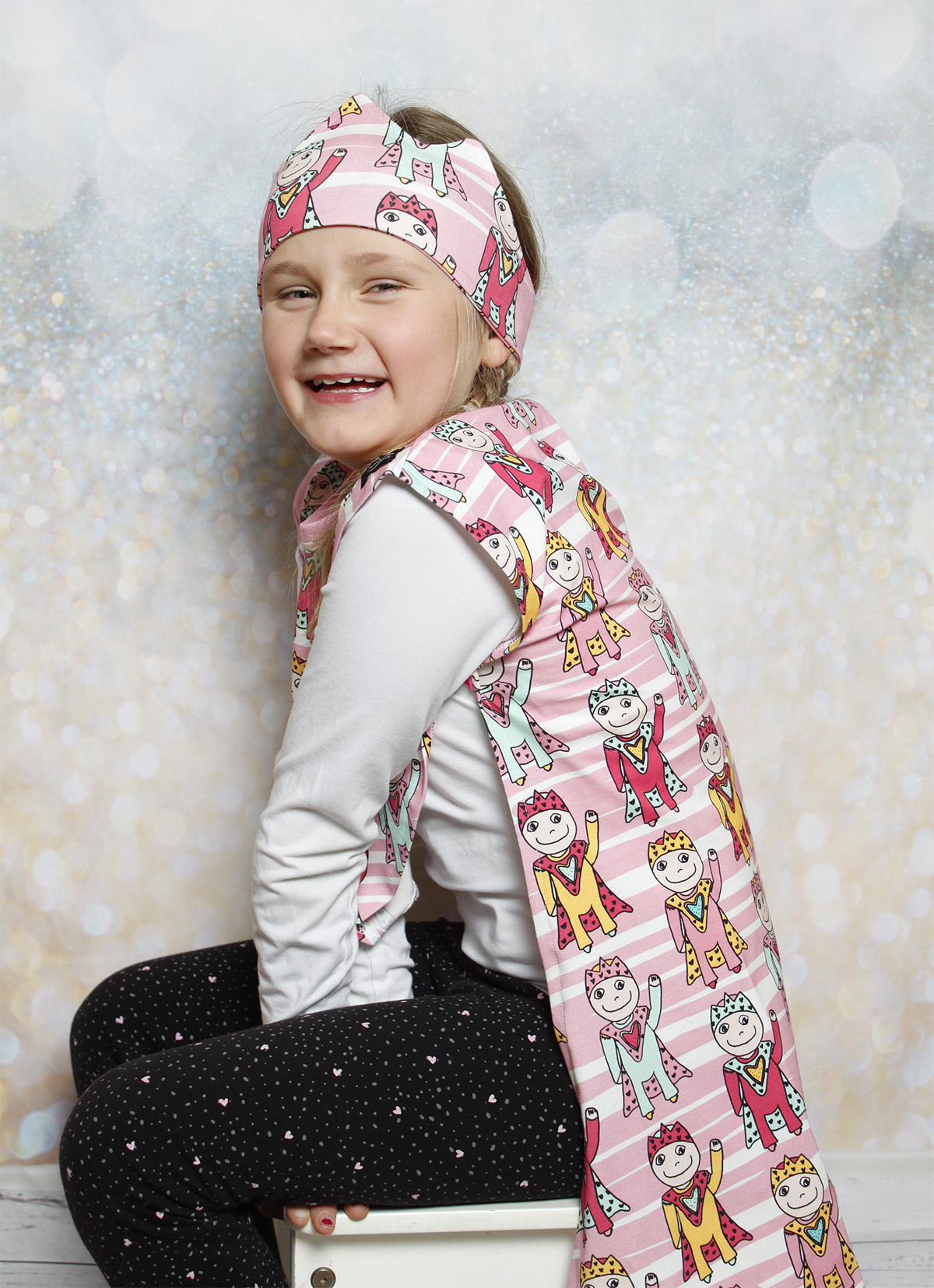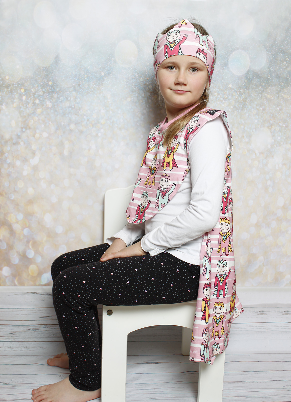 Prinsessa, mikäs sen kivempaa kuin leikkiä prinsessaa. Lapsi itse on kankaassa oleva prinsesssa. Hänellä on yllään viitta ja panta päässä, ihan kuten kankaassakin. Viitan prinsessan voi nimetä vaikka lapsen oman nimen mukaan. Sukkahousut ja paidan jos etsii kankaan Prinsessan väreihin sopivaksi, niin täydellistä!